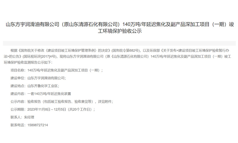 山東方宇潤滑油有限公司(原山東清源石化有限公司)140萬噸/年延遲焦化及副產(chǎn)品深加工項目(一期)竣工環(huán)境保護驗收公示