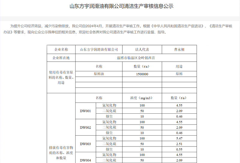 • 山東方宇潤滑油有限公司清潔生產(chǎn)審核信息公示